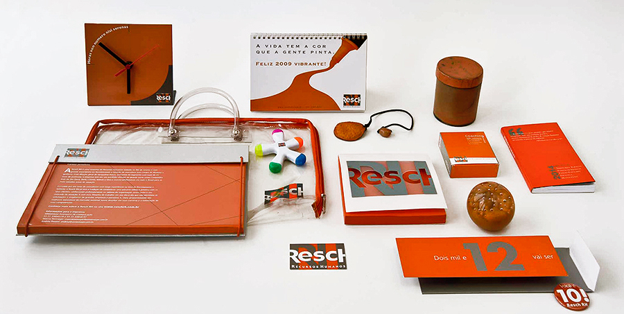 Marcas de empresas do grupo, selo de 7 anos e brindes institucionais