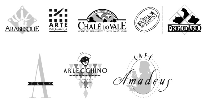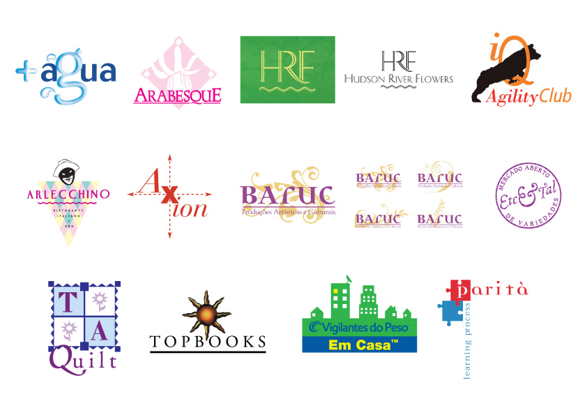 + Água (academia de hidroginástica) / Arabesque (flores) / Hudson River Flowers (flores, em NY) / iQ Agility Club (adestramento de cães, em NJ) / Arlecchino (restaurante)* / Axion (produções culturais) / Baruc (produções artísticas – com variações formais) / Etc&Tal (mercado de variedades) / T.A. Quilt (produtos de decoração) / Topbooks (editora) / Vigilantes em Casa (publicações) / Paritá (sistemas de aprendizagem)